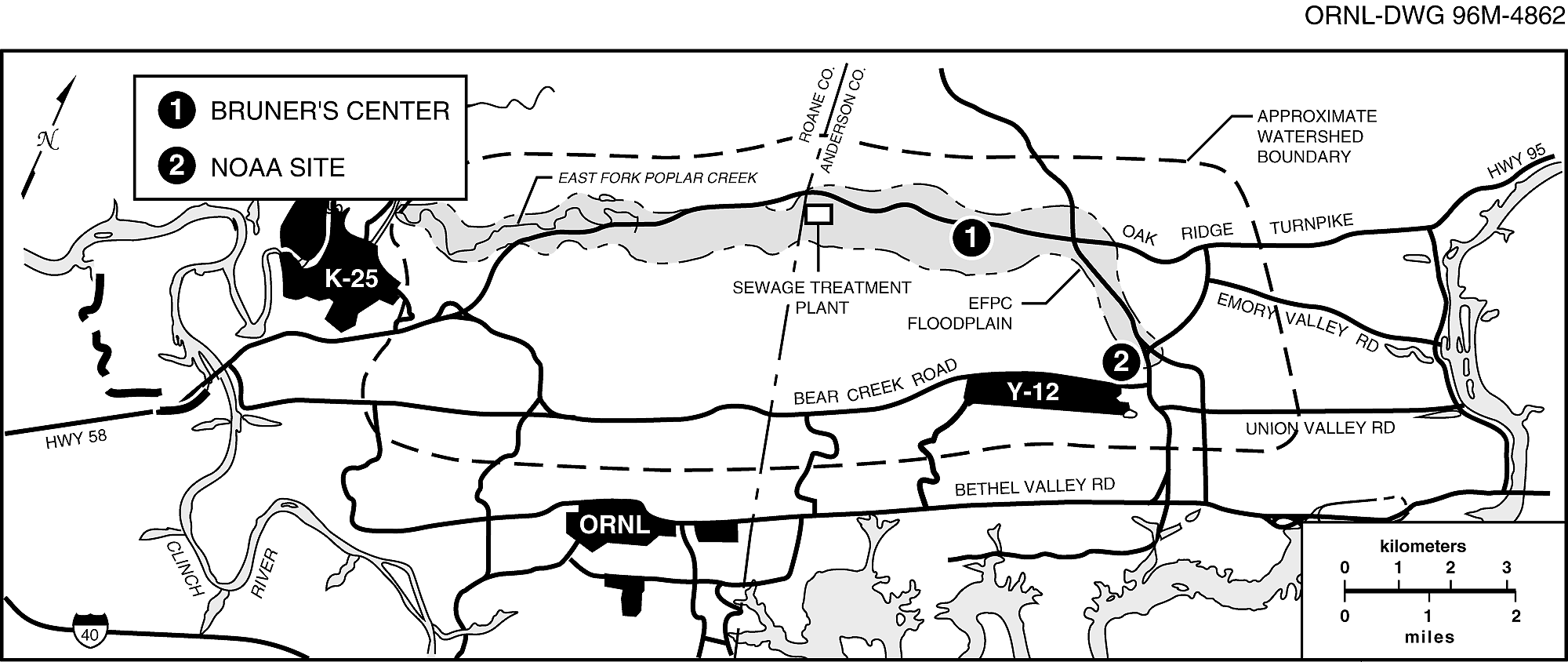 Fig. 3.3. The ROD for Lower East Fork Poplar Creek calls for excavating the Bruner's Center site along the Oak Ridge Turnpike and the NOAA site along Illinois Avenue.