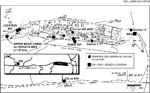 Fig. 4.10. Surface water and sanitary sewer radiological sampling locations at the Y-12 Plant.