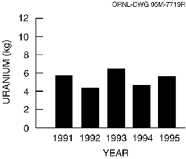 Fig. 4.13. Five-year trend of total uranium discharges from the Y-12 Plant Sanitary Sewer.