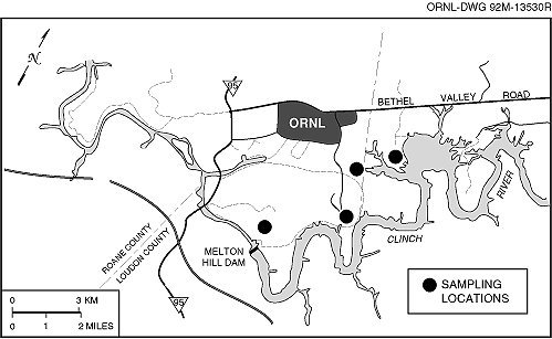Fig. 4.29. Sampling locations for polychlorinated biphenyls in the greater ORNL area.
