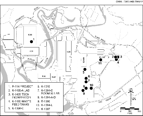 Fig. 4.6. K-25 Site active point sources of airborne radioactivity.