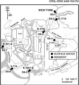 Fig. 5.15. Monitoring locations for surface water at the K-25 Site.