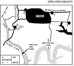Fig. 5.6. Locations of ambient air monitoring stations at ORNL.