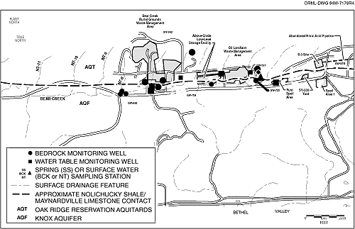 Fig. 7.15. Locatins of waste management sites and monitoring wells sampled during 1995 in the Bear Creek Hydrogeologic Region.