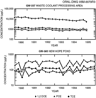 Fig. 7.9. Quarterly volatile organic compound concentrations in groundwater in selected wells in the East Fork regime.